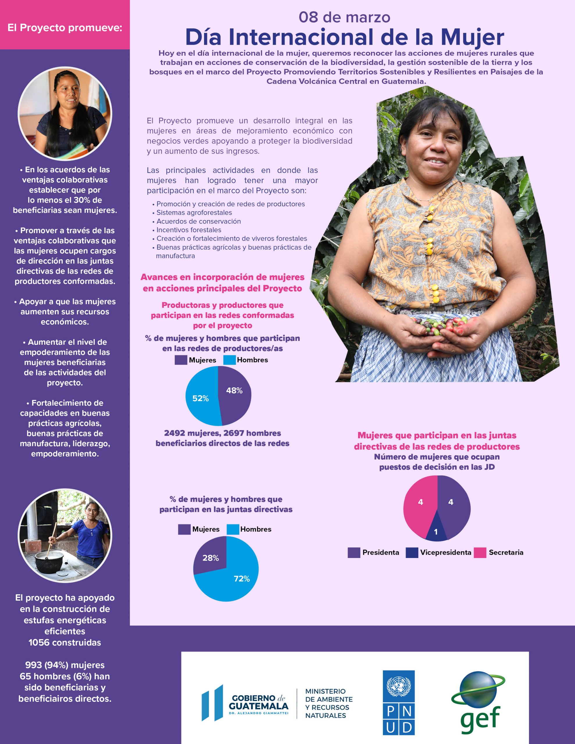 Como parte de las acciones del Proyecto para apoyar en la reducción de esta brecha, está realizando el cumplimiento a su plan de transversalización de género, que busca sumar esfuerzos para cumplir los compromisos de país y los Objetivos de Desarrollo Sostenible ODS principalmente el ODS 5 Igualdad de género, actuctualmente está realizando una investigación para sistematizar experiencias del proceso de empoderamiento económico de las mujeres beneficiarias directas de los programas de incentivos forestales PINPEP Y PROBOSQUE en los últimos 10 años.