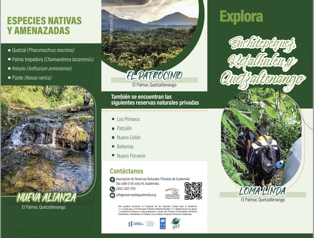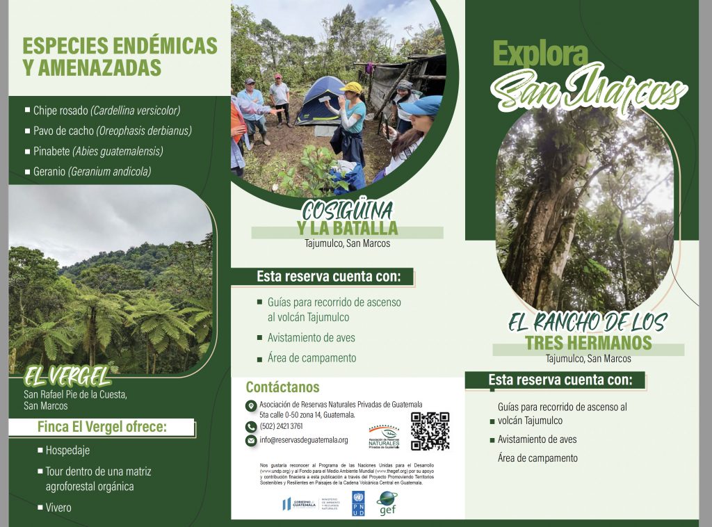Te compartimos el video: Conectando el paisaje a través de áreas protegidas, Experiencia del Comité de Autogestión Turística CAT Tajumulco San Marcos, Guatemala. Para que conozcas más sobre las acciones que realizan la Asociación de Reservas Naturales Privadas de Guatemala en el marco del acuerdo colaborativo con el Proyecto del Ministerio de Ambiente y Recursos Naturales -MARN-, denominado Promoviendo Territorios Sostenibles y Resilientes en Paisajes de la Cadena Volcánica Central en Guatemala, Cooperación no reembolsable que es financiado con recursos del Fondo para el Medio Ambiente Mundial -FMAM/GEF-, con el apoyo del Programa de las Naciones Unidas para el Desarrollo -PNUD-.