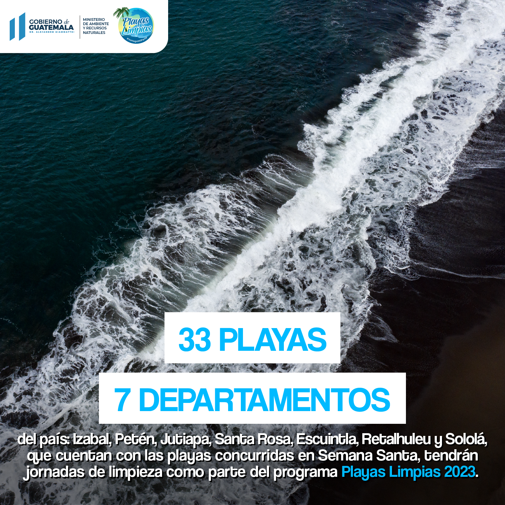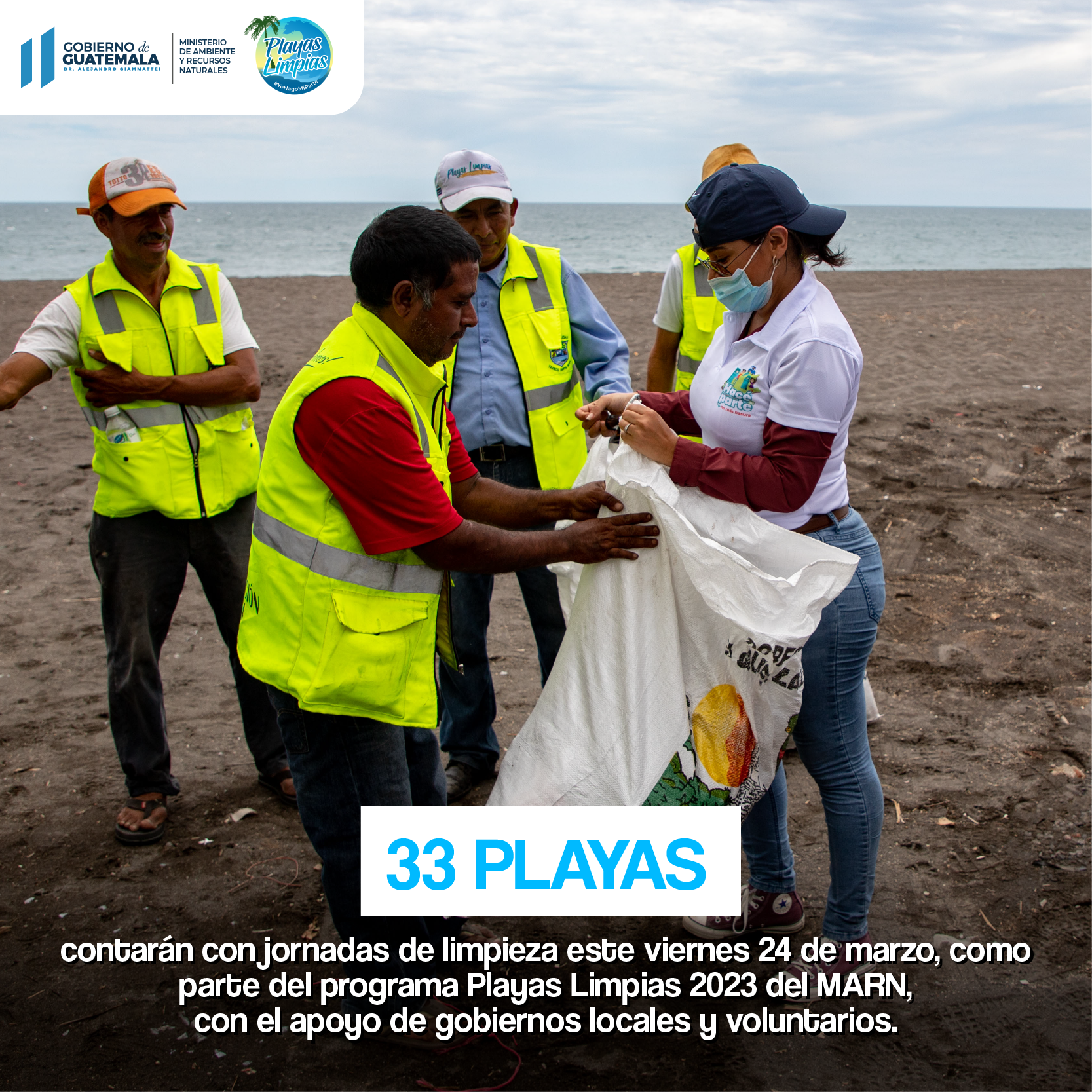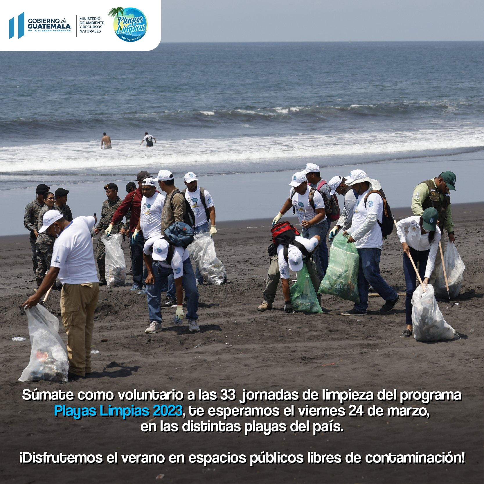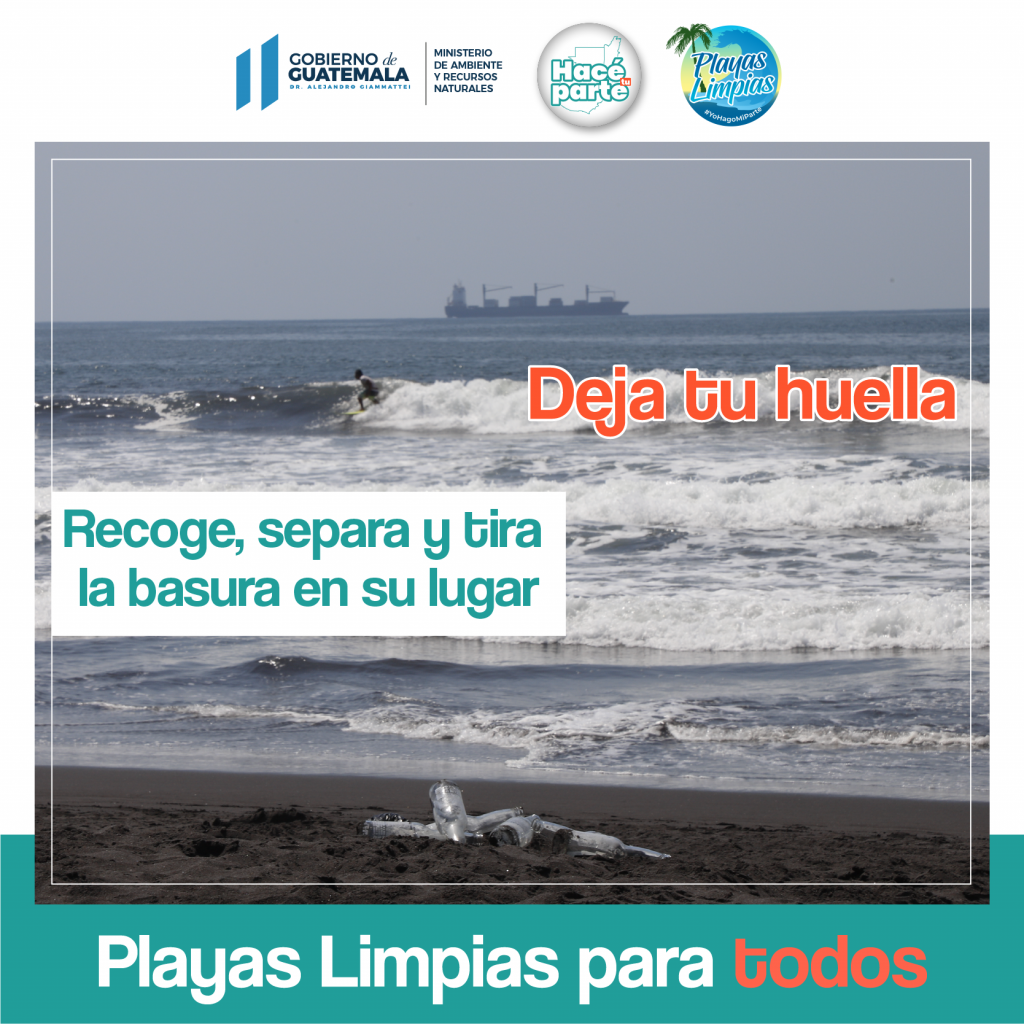 Playas Limpias es un programa que se desarrolla todos los años por el Ministerio de Ambiente y Recursos Naturales a nivel nacional, con el objetivo de eliminar la contaminación y promover la educación ambiental en los guatemaltecos.