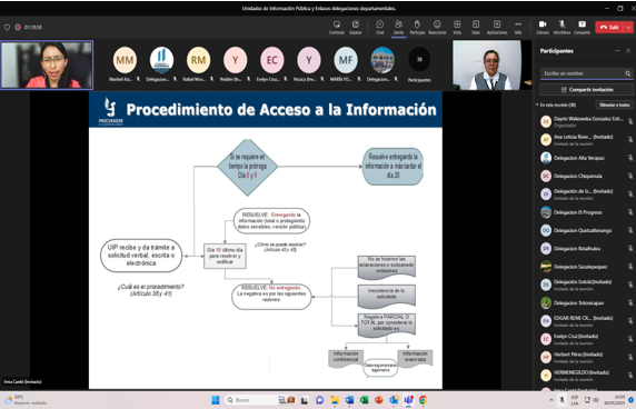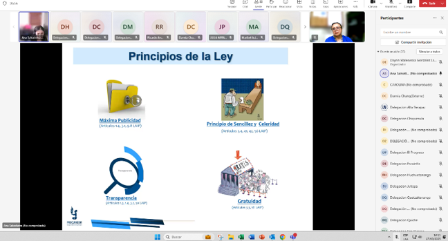 El día diecisiete de marzo de 2025, como parte de las acciones de formación y fomento del derecho al acceso a la información, se impartió una capacitación sobre la “Importancia del acceso a la Información y principios de la LAIP”, con el apoyo de la SECAI. La capacitación fue dirigida a los enlaces de las Delegaciones Departamentales con la participación de 31 personas y tuvo como propósito fortalecer el conocimiento sobre la normativa y su aplicación.