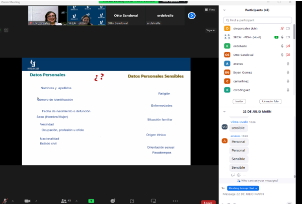 El día 22 de julio de 2023, se impartió la capacitación virtual por medio de la plataforma Zoom, dirigida a las 54 dependencias (delegados y suplentes) del Ministerio de Ambiente y Recursos Naturales, con la participación de 45 personas, se contó con la colaboración de la Secretaria de Acceso a la Información Pública -SECAI- siendo la disertadora Licda. y Ms. Dayrin Gonzalez Estrada. El tema a tratar fue “Ley de Acceso a la Información Pública, contenido en el Decreto 57-2008 Obligaciones y Sanciones”.